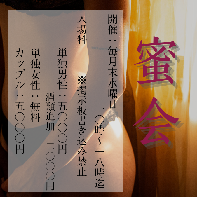 こんにちは! 大阪のハプニングバー(ハプバー) Member's salon Perv の女性スタッフMです(^。^) 今回は定期イベント紹介 三部作の最終回! 「蜜会」 についてです♪ ![]() 蜜会は毎月末水曜日に 行なっています。 普段は14:00〜Last そして掲示板への 書き込みをすることで 特典があるのですが その日だけは 「10:00〜18:00の営業時間」 「掲示板への書き込み禁止」 となっております(^。^) 店内にいらっしゃるお客様は その中にいる人しかわからない というドキドキな日です❤︎ ぜひあなたもドキドキを体験しに 来てくださいね(^_^)♪ |