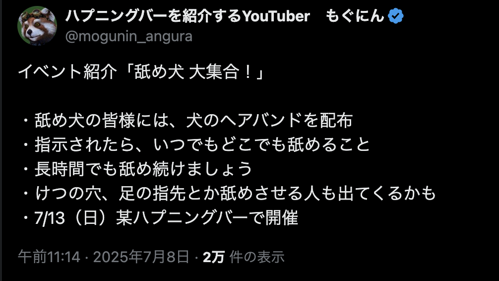 こんにちは。 大阪のハプニングバー(ハプバー) Member’s salon Perv 男性スタッフのぴのです。 既に各所で話題沸騰になっている イベント 「舐め犬 大集合-Anytime Lickness-」 について説明します! 7/13 日曜日 12:00〜5:00まで終日開催 ![]() ![]() 今回のイベントは一日中 長時間に渡って舐めることができる様に、日曜日に開催する運びと させて頂きました。 ルールは3つ! 〈ルール1〉 舐め犬の皆様には、犬のヘアバンド 若しくはカチューシャを配布します。 着用が「私は舐め犬です」の サインです。 〈ルール2〉 指示されたら いつでも何処でも舐めること。 飼い主様に指示されたら言うことを 聞きましょう。 犬の気持ちに浸れる様に 当日はいくつか「仕掛け」を 用意しています。 嬉しそうにワンちゃんになりきると 飼い主様は喜んでくれます。 〈ルール3〉 長時間でも舐め続けること。 飼い主様を満足させる。 それが舐め犬の役目です。 『舐め犬が欲しい皆様』 あなたの為に その日パフは沢山の奉仕犬で 溢れます。 あなたが気に入ったワンちゃんに 好きに指示してあげてください。 沢山のワンちゃんを 手懐けてもらっても結構です。 その日、舐め犬は あなたの為に喜んでご奉仕します。 『舐め犬の皆様』 飼い主様の為に、ご奉仕しましょう。 奉仕する喜びを舌先と全身で感じながら、ワンと鳴き、従者であることを 体現しましょう。 そして、舐め犬には性別は 関係ありません。 雄犬も雌犬も大歓迎です。 7月13日(日) あなたの欲望に応える「舐め犬」と、 奉仕に満ちた時間をご一緒しましょう。 ご来店、お待ちしております。 |