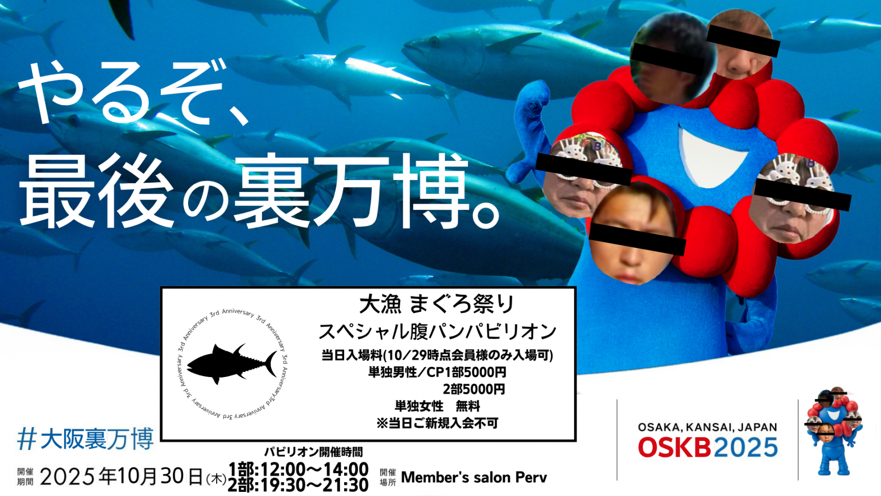 こんにちは! 大阪のハプニングバー(ハプバー) Member's salon Perv 裏方Mです(^。^) さて、10/30に 開催しました 最後の大阪裏万博と 実はひっそりと 迎えておりました パフ三周年 平日にも関わらず 予想を大きく上回る 多くのお客様のご来店 誠にありがとうございました! 今回の大阪裏万博のテーマは パフの大漁まぐろ祭り 〜スペシャル腹パンパビリオン〜 ![]() 「パフのいえば」の まぐろ祭りではなく まさか本当の 「まぐろ」祭りだとは! 私も開催の2週間前に オーナーから 聞いた時は 驚きました笑 そして お祝いの言葉やお品を いただきまして 心より感謝申し上げます。 ![]() ![]() ![]() 4年目も スタッフ一同 感謝の気持ちを忘れず 会員様と共に よりより空間作りを 心がけてまいります。 改めまして今後とも Member's salon Pervを よろしくお願い申し上げます。